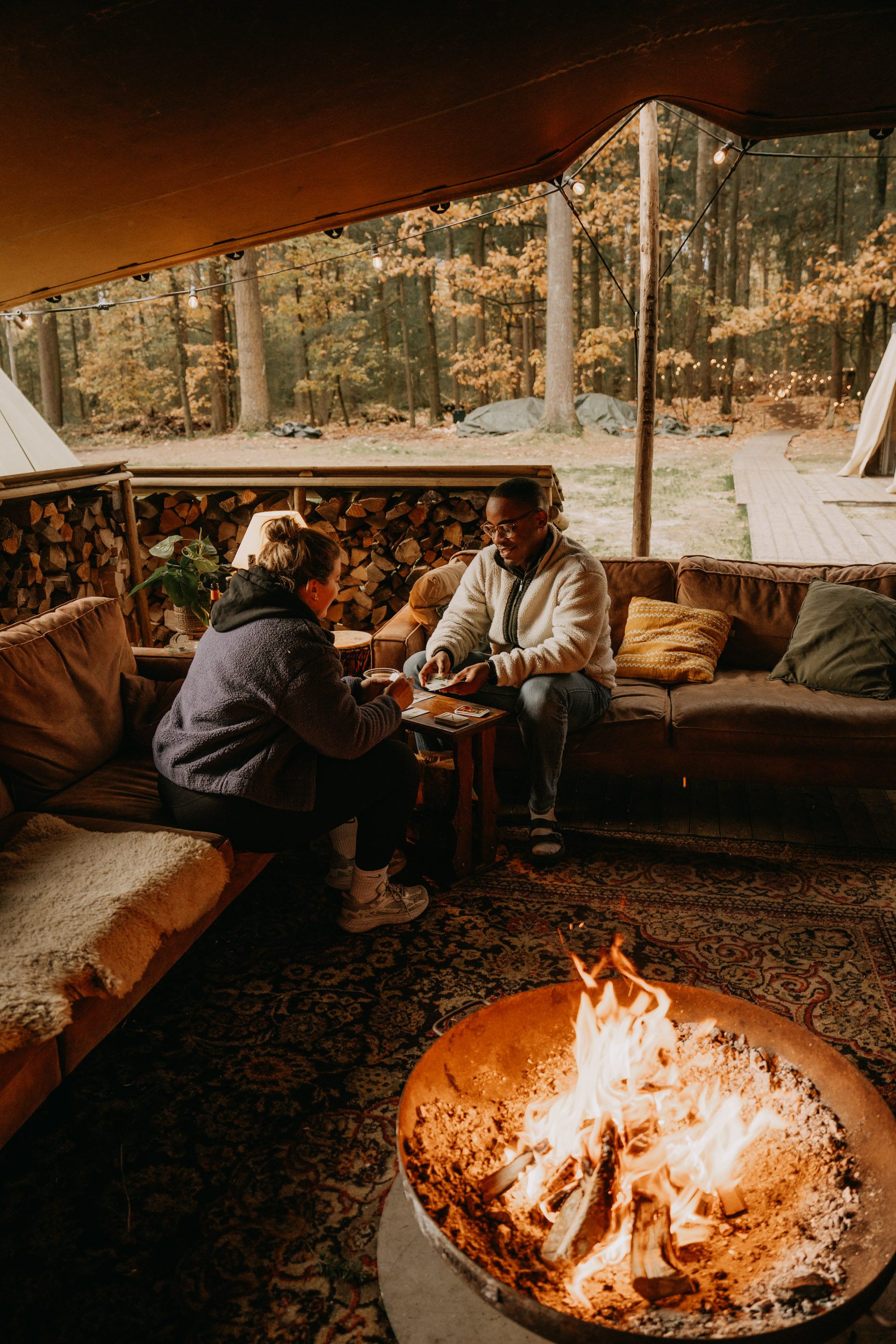 In de herfst hangt er vaak een mystieke sfeer in het bos. De ochtenden zijn fris en mistig, ideaal voor een lange wandeling of een rustig koffiemoment bij het vuur. Tegen de avond bereid je een stoofpot boven open vuur en nestel je je daarna in de yurt voor een spelletjesavond bij de kachel.